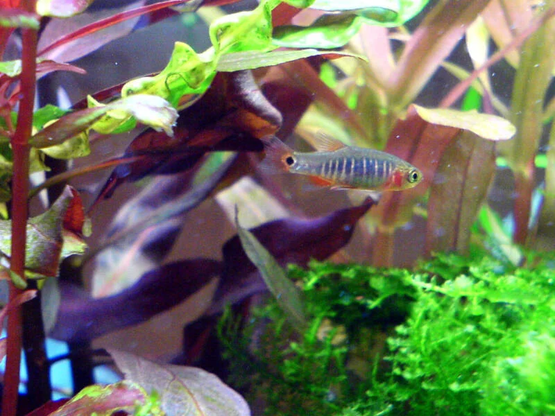 Emerald Dwarf Rasboras are fairly easy to care for, as long as they live in stable water parameters with good water quality. These fish are peaceful and thrive in groups; however, they are shoaling fish rather than a schooling fish, so the males will often dance and spar with each other. The more of these fish there are in your tank, the less shy they will act. When these fish are healthy and are placed in a well-cycled and densely planted aquarium, it is fairly likely that they will spawn, and you may see fry start to appear. Like all rasboras and danios, they are very peaceful and totally safe to keep with other fish (as long as the other fish are peaceful, too!), snails, shrimp, and live plants. They do best in tanks that have plants, rock, or driftwood that provide them with cover.