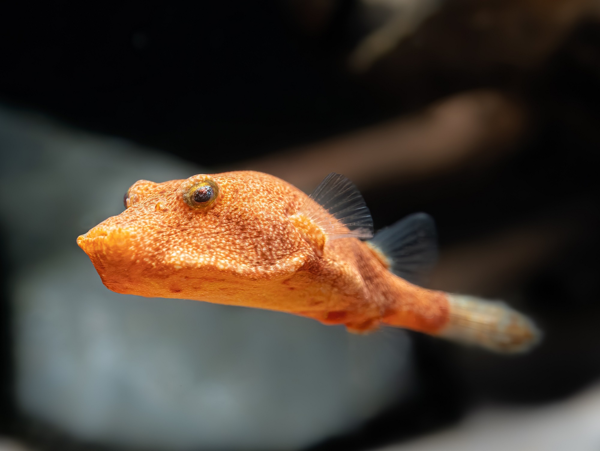 The Red Congo pufferfish is a perfect ambush predator! Well, almost perfect, because this puffer fish lacks speed, but is a master in disguise. It easily blends into its surroundings with its camouflage ability, like a chameleon. This puffer has a wide variety of different colors, from red to brown, orange, yellow, grey and black, to blend in with its surroundings between rocks, sand and wood, but when needed it easily turns into orange or a full red color. This fish can grow up to 15 cm and is nicknamed potato fish because it kind of looks like a potato. The Tetraodon miurus is a bottom fish that digs itself into the sand and waits for the right moment. That moment is when the prey comes close to their nose and then they attack from below and devourer their prey. Their mouth is designed for this attack, positioned pointing upwards. Other animals do not notice the puffer fish as it lays comfortably dug into the sand with just their eyes visible, which they can move in all directions separately from one another, giving them a perfect peripheral view. This puffer fish needs to be kept alone in the aquarium, because it will see anything swimming around it as food.